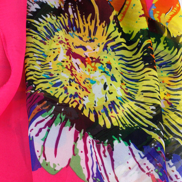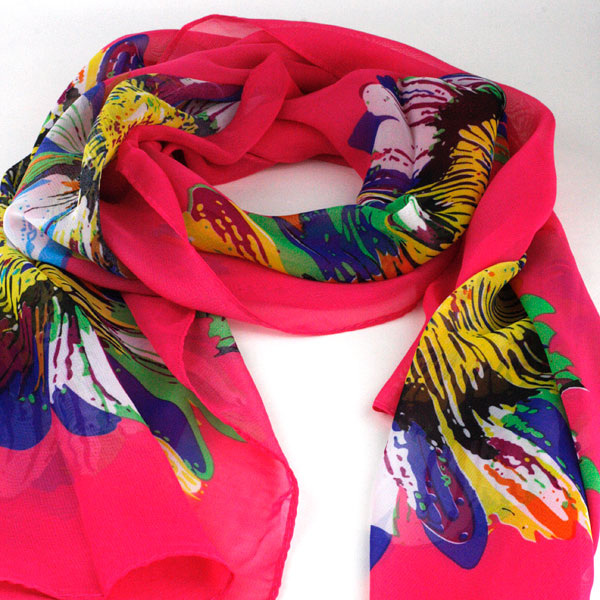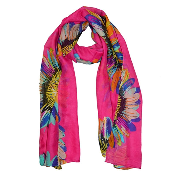 Silk Polyester Blend Summer Flowers Pink Scarf – a long pink silk, polyester blend scarf with multi-coloured flower design.
