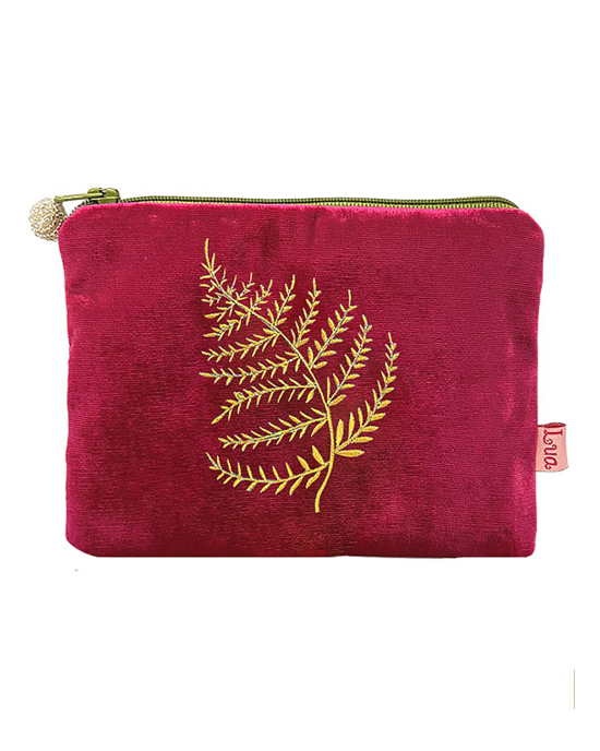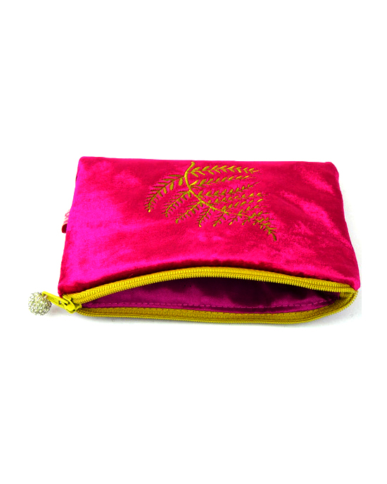 Bright Pink Silk Velvet Fern Purse – a lined silk velvet purse / pouch in a striking pink decorated with a large embroidered fern in gold, which is closed with a yellow zip with beaded ball detail. The purse has pink satin lining.