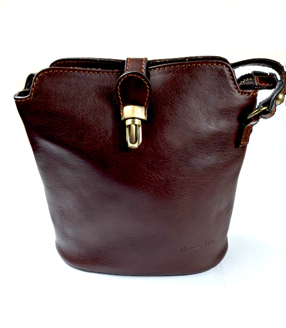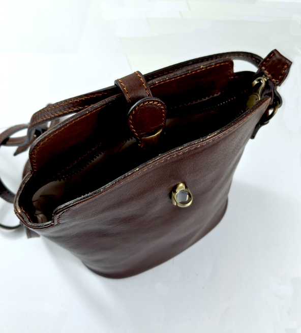 Chocolate Brown Italian Leather Small Shoulder Bucket Bag – a lined Italian leather shoulder bag in a dark chocolate tone, with a central zip and clip closure and an external zip pocket.