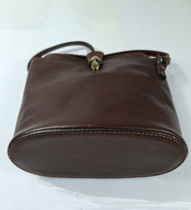 This leather bag is lined with a creamy beige material, which is over printed with “Made in Italy, Firenze”. There is an internal zip pocket and a long, adjustable shoulder strap. The clip closure, zips, and fittings at the bases of the strap are in a bronze tone.