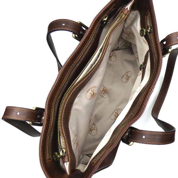 The pale beige lining of the 2 outer pockets is printed with the words: “Made in Italy, Firenze”. On the leather of one of the pockets is embossed the words: “Genuine Leather, Made in Italy”. The inner pocket of the shoulder bag is not over printed.