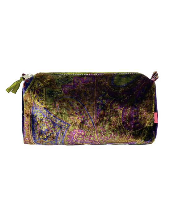 Embossed Silk Velvet Cosmetic Purse – Olive, Damson – a cosmetic purse in a rich olive and damson embossed, soft silk velvet, closed with a green zip and lined with a olive toned satin.