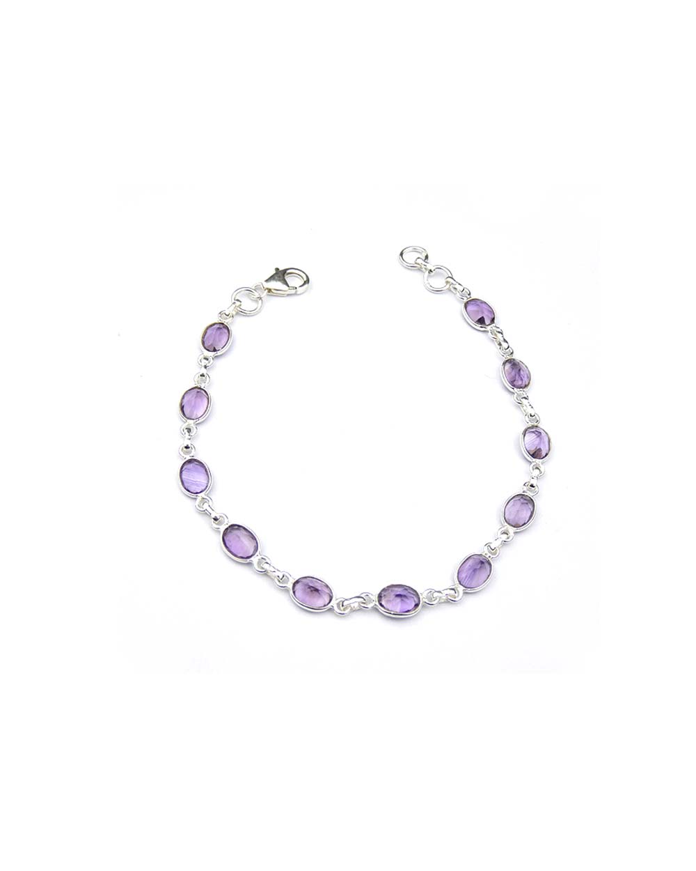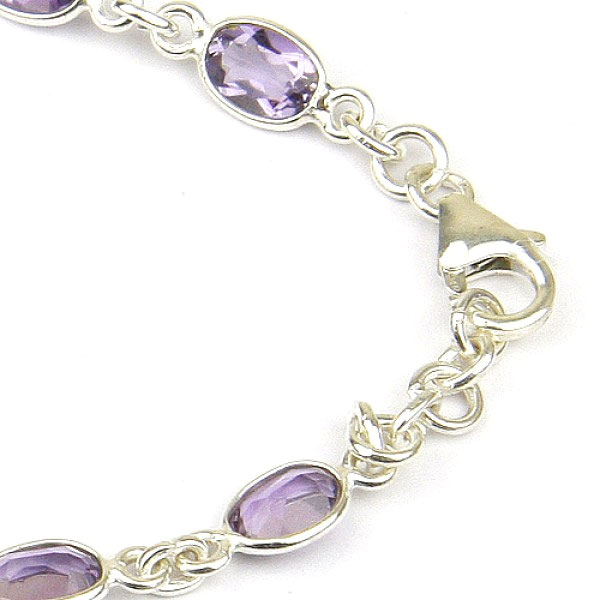 Silver chain links separate oval purple amethysts set in silver and the bracelet closes with a claw clasp. This is one of range of light silver and gemstone bracelets from “The Cascade-Collection”, that are a delight to wear.