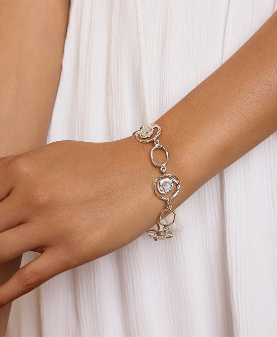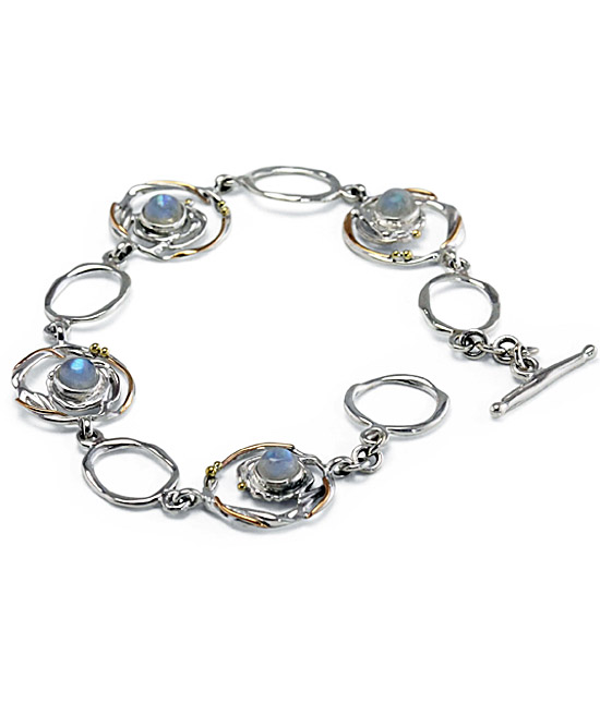 Moonstone Silver Bracelet with Gold Detail – undulating silver encapsulates 4 round Moonstones, each entwined with 14kt gold fill wire detail and separated by organic silver links. The bracelet is fastened by a T-bar.