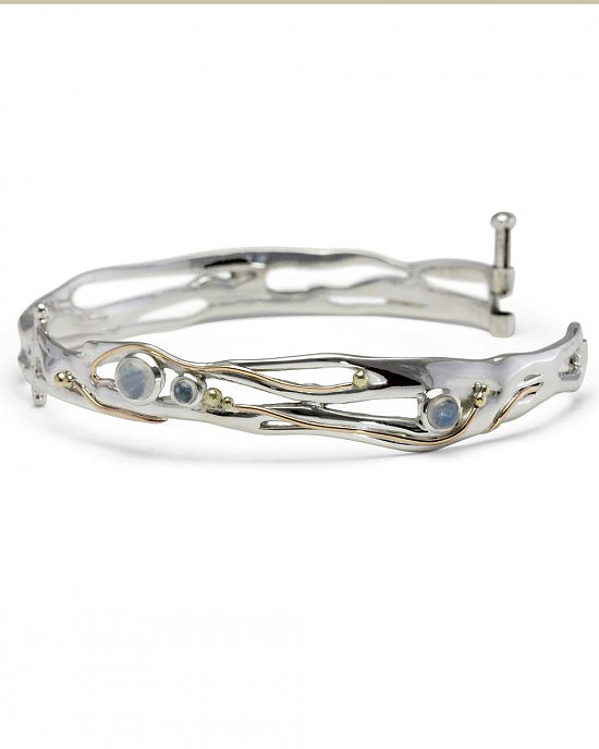 Silver Bangle with Round Moonstones & Gold Detail – delicate open weave hinged silver bracelet by Banyan Jewellery, set with 3 round Moonstones of differing sizes and overlaid with 14k yellow gold flowing detail.