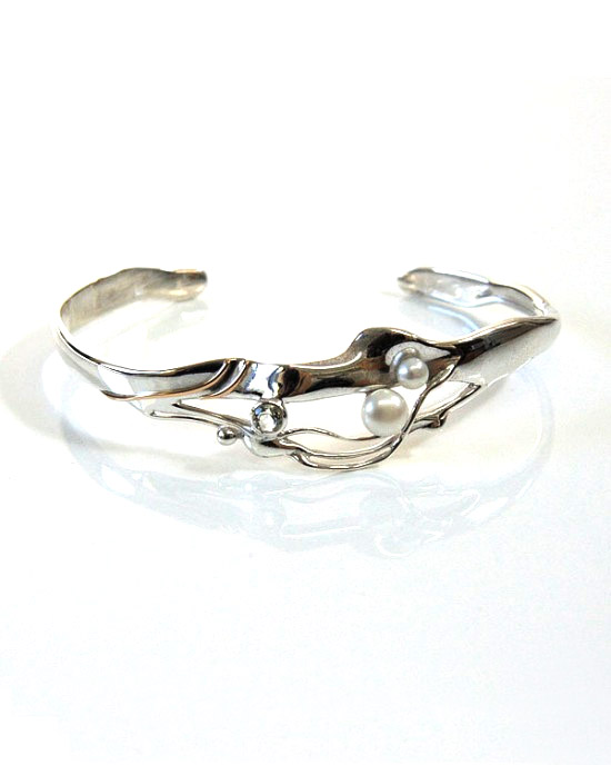 Silver Cuff Bracelet, Pearl Green Amethyst Goldfil – A sterling silver bracelet in the form of a ‘cuff’ which slips around the wrist silver cuff, with flowing silver strands and decorated with 2 pearls of differing sizes, a faceted, very pale, green Amethyst and a flourish of double-line goldfill.