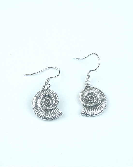 Ammonite Pewter Earrings – pewter earrings, with surgical steel hooks, in an Ammonite design, which are hand-made by artisans and hand finished by LadyCrow.