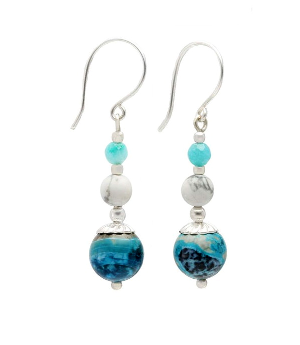 Blue Chalcedony & White Howlite Silver Earrings – silver hook earrings on which Chalcedony and White Howlite beads are separated by small silver beads. At the top of the large blue chalcedony bead is a decorated silver mount,