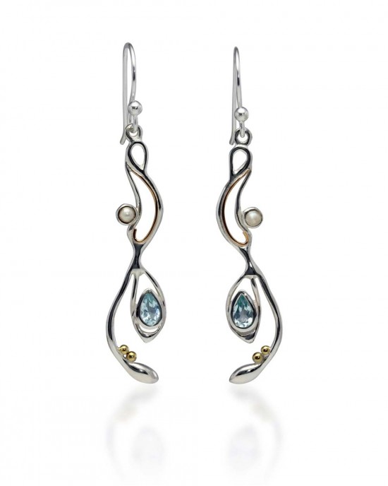 Characteristic of the organic forms of the Banyan jewellery, these hook earrings are formed by curving silver strands of differing thicknesses, which support a pretty blue topaz and a small circular freshwater pearl. The earrings are finished with gold plated detail.