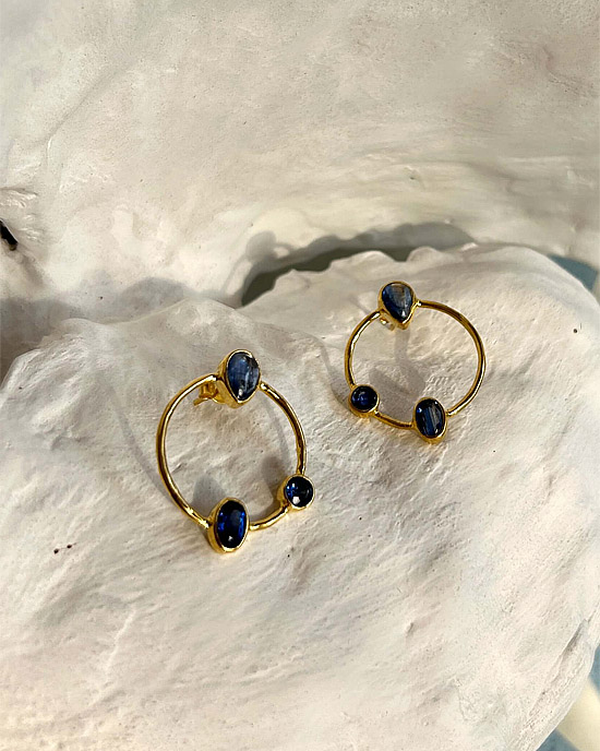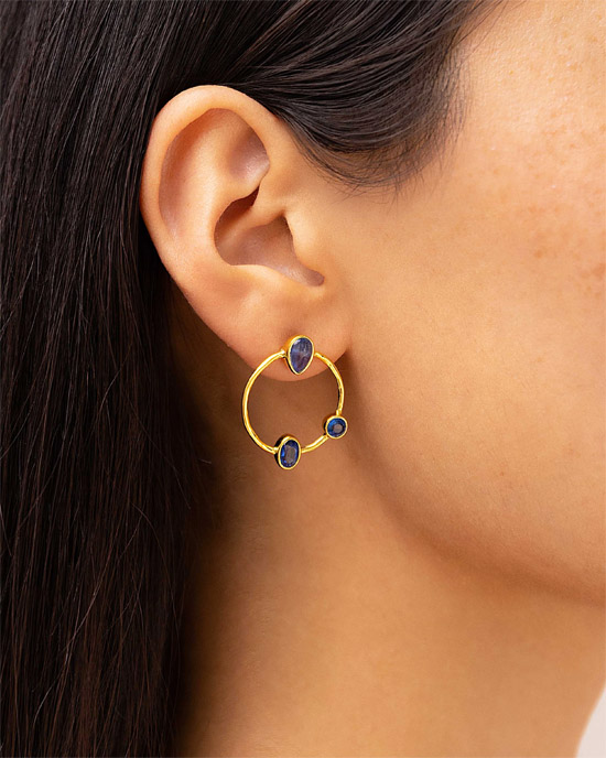 Gold Vermeil Silver Kyanite Trinity Hoop Earrings – sterling silver stud earrings with gold vermeil plating, by Banyan Jewellery, in the form of a hoop and set with Kyanite stones in 3 shapes: teardrop, round and oval.