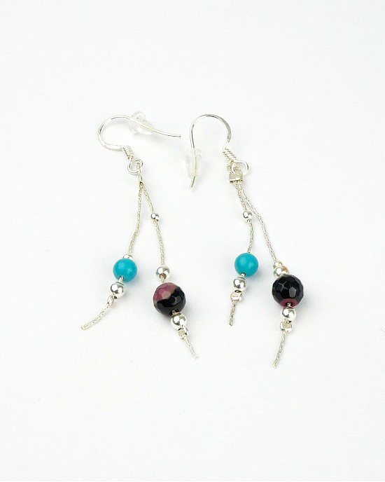Long Silver Hook Earrings, Turquoise, Jasper Beads – 2 strands of fine silver chain fall from the ear hook, one with a Turquoise bead and silver beading, the other with a Jasper bead & silver beads.The earrings are designed by Banyan.