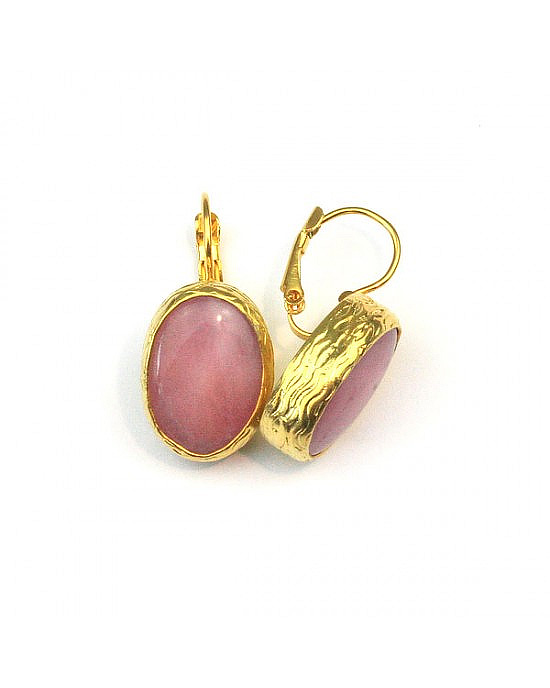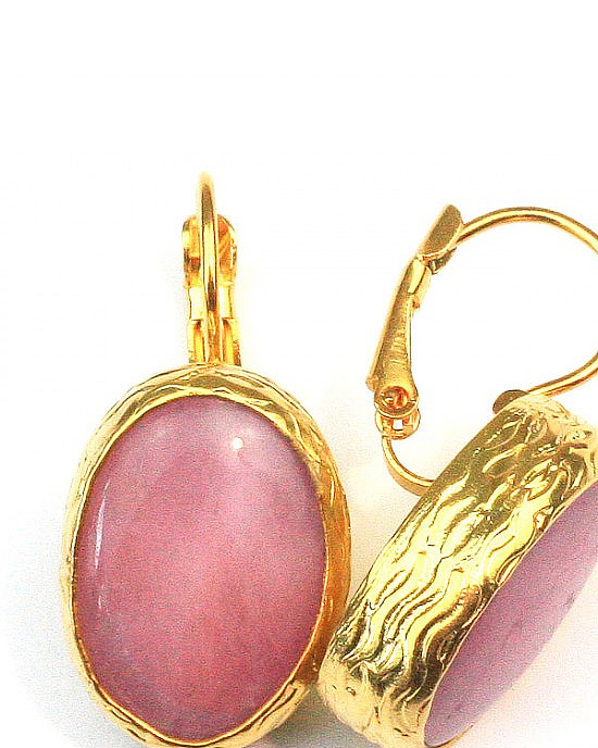 Rose Quartz Disc Earrings in 24k Gold Plate – An attractive rose quartz disc drop, hooked earrings with 24k gold plated setting and a clipped hook back.