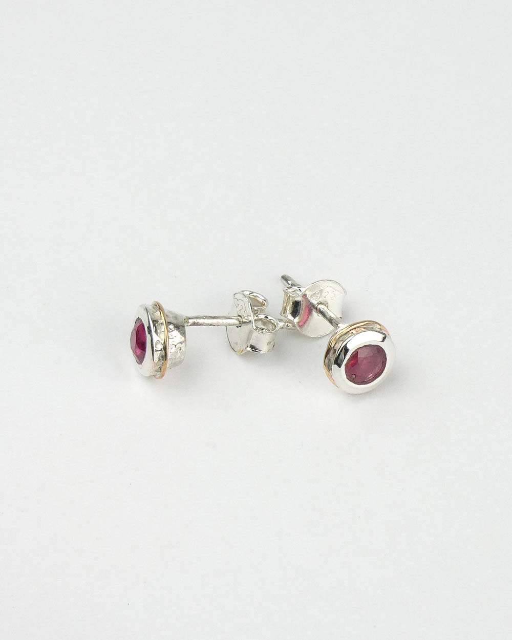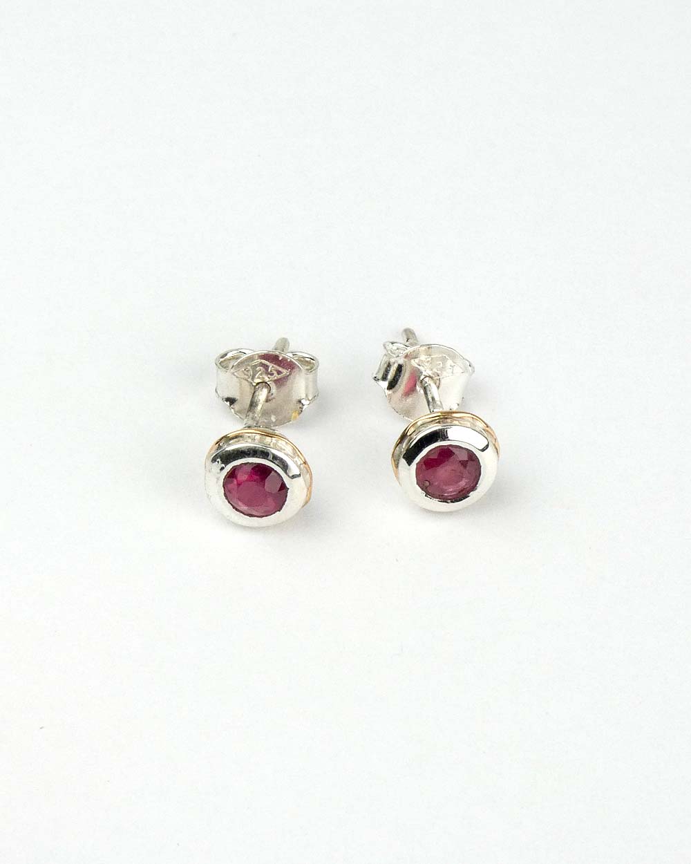 Ruby Silver Stud Earrings – lovely silver stud earrings, by Banyan of Devon, on which are set faceted, round, rubies, with goldfill detailing.