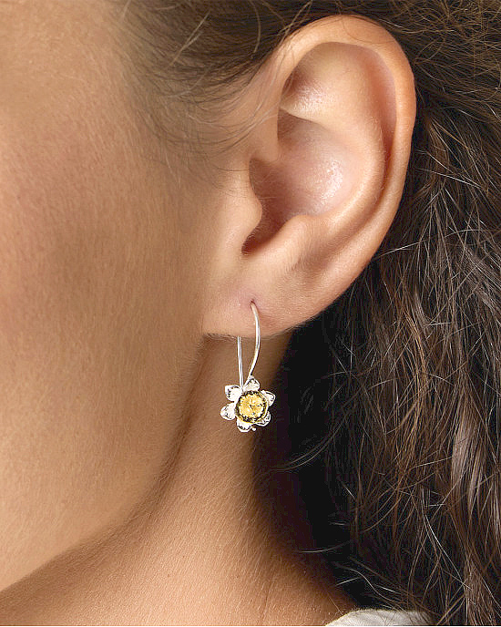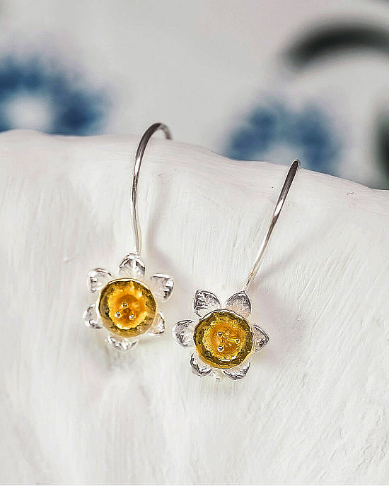 Silver, Gold Daffodil Hook Earrings – hook earrings handcrafted in sterling silver, with fine details, into the form of daffodils, with the centre trumpet finished with 14kt gold plating.