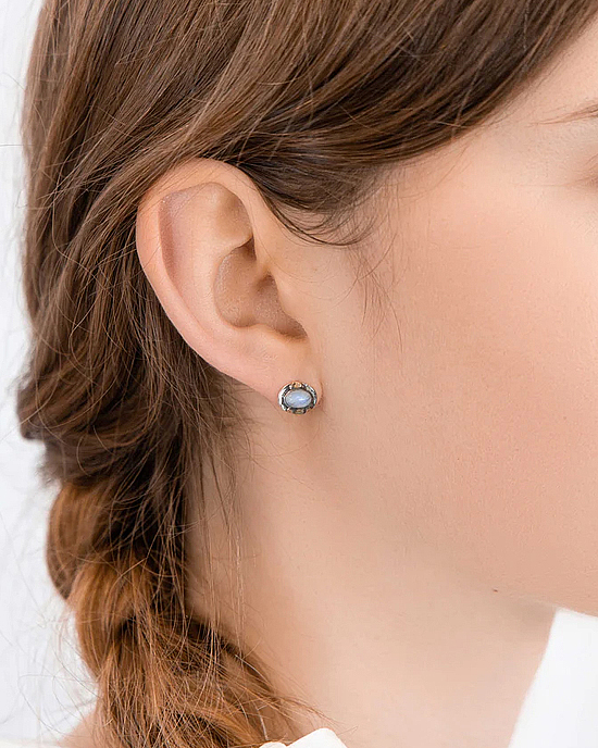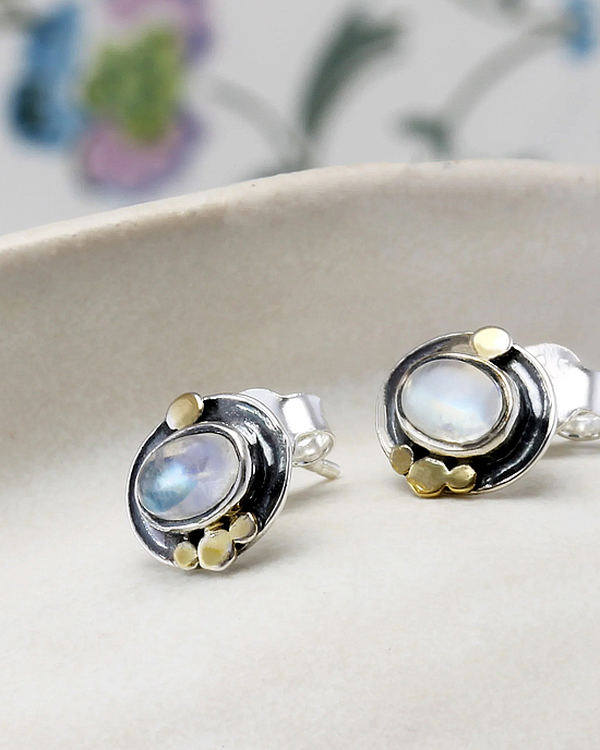 Silver Stud Moonstone Earrings – Lovely small silver stud earrings set with polished moonstones, which shine with blue, green and pink tones, designed by Banyan of Devon. The silver border to the earrings are decorated with 4 brass dots.