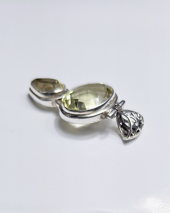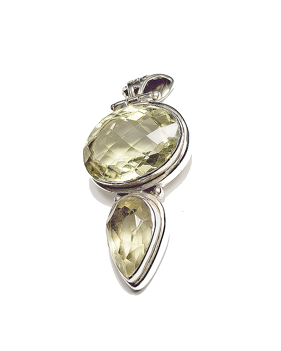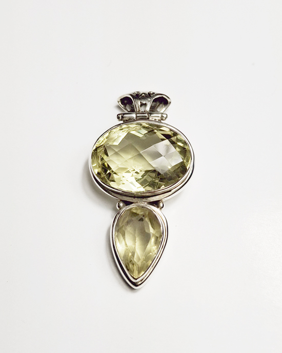 Double Lemon Topaz Silver Pendant – a decorative silver hinge holds an oval Lemon Topaz under which is a smaller, teardrop shaped, Lemon Topaz stone, both held in a silver mount. The stones, which are faceted, are an attractive soft yellow tinged with a touch of green.