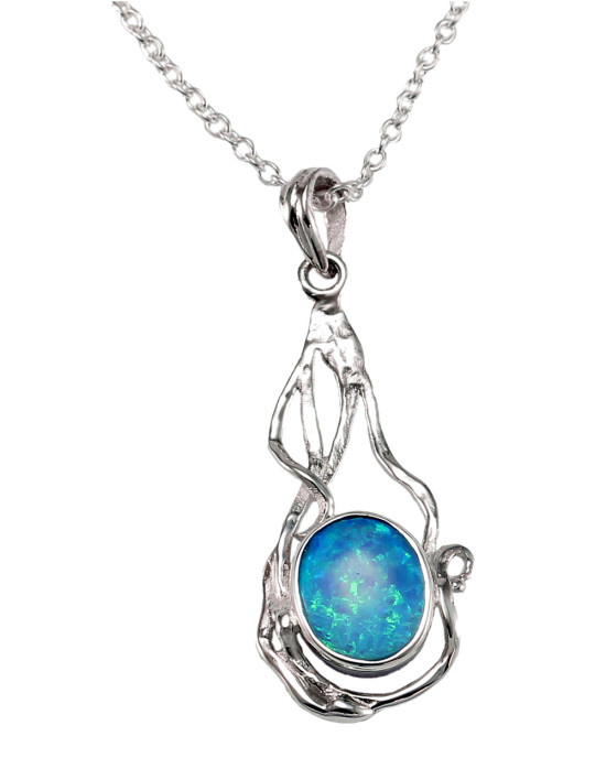 Silver Tresses Pendant with Opalites – Flowing tresses of silver encapsulate an attractive, iridescent blue-green Opalite to form this pendant.