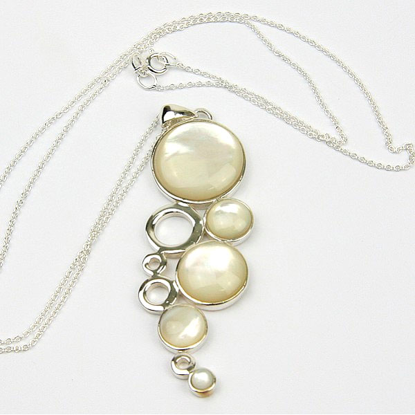 Sterling Silver Shell Pendant – this is an elegant long sterling silver pendant with a circle design and in a curved form, set with creamy coloured shell and held by a silver chain.