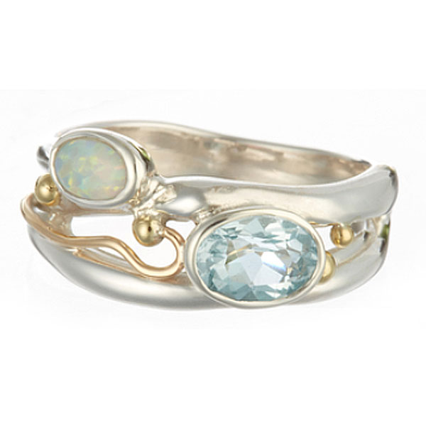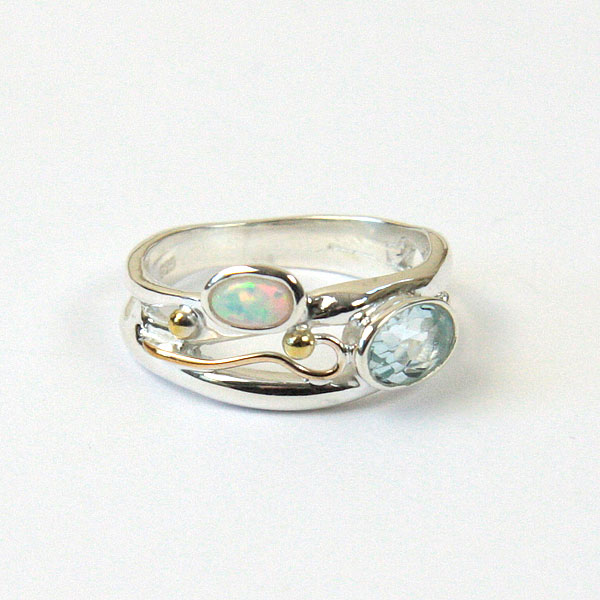 This silver ring is set with a soft blue faceted, oval topaz of approx. 8mm in length, and a pale opalite, which shines with tints of pinks and green. THe ring is finished with goldfill wire and brass detailing.