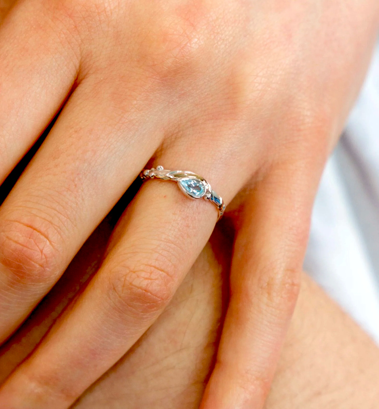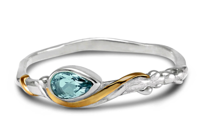 Blue Topaz Silver Ring – A Teardrop Blue Topaz set into a Silver Ring in an organic design typical of Banyan Jewellery.