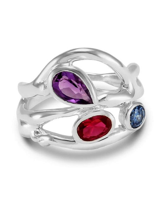 Multi-Coloured Stones Silver Ring – A striking and colourful silver ring in an organic design, set with a teardrop shaped, faceted, purple amethyst, an oval faceted ruby CZ and a round blue alexandrite CZ.