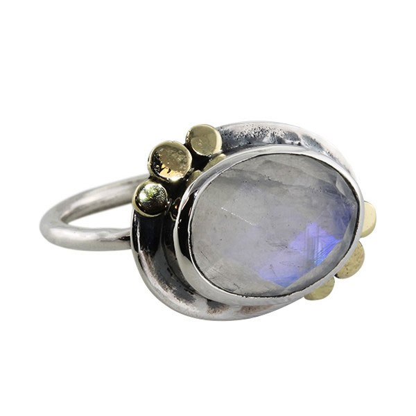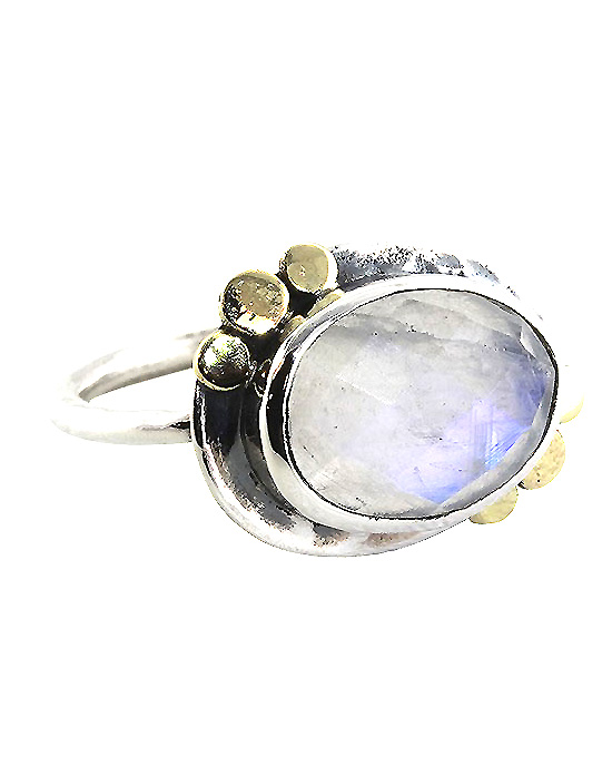 Oval Moonstone Silver Ring, a distinctive silver ring set with a faceted oval Moonstone, which glints with blue lights.