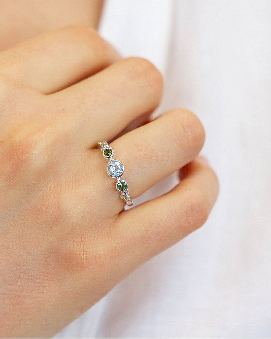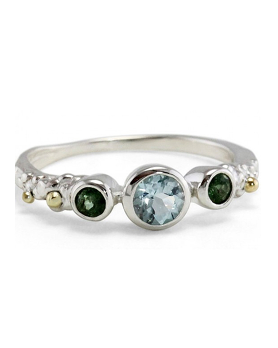 Silver Ring with Blue Topaz & Green Tourmaline – a pretty, slender silver ring set with a central faceted Blue Topaz and 2 smaller faceted Green Tourmaline stones, with flower and goldfill detail.