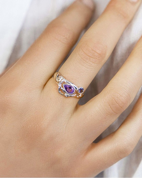 Silver Ring with Flower & Opalites – a silver ring in 3 joined bands, set with a round pale opalite, and a vibrant, oval, Blue Opalite and a flower fashioned in silver with a brass centre. Designed by Banyan Jewellery of Devon, UK