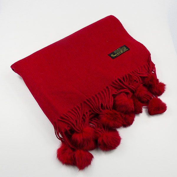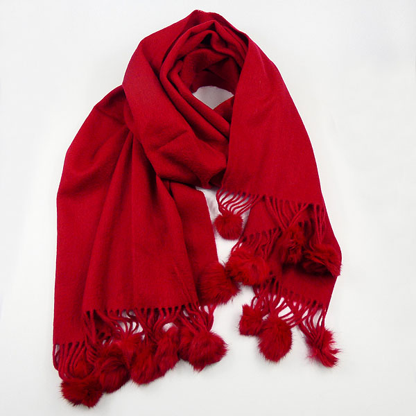 The scarf is finished with attractive fluffy rabbit fur pom-poms.
