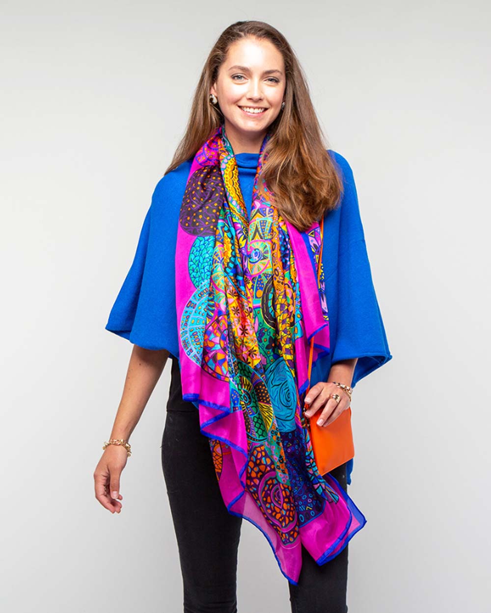Large Silk Magenta Scarf, Geometric – a long pure silk scarf overlaid with geometric designs in rich tones of magenta, yellow, orange, blue and green.
