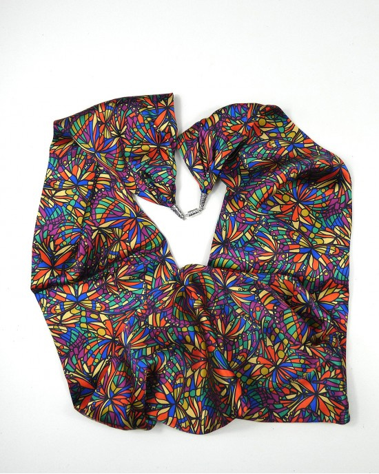 Liberty Silk Satin Scarf, Bright Jewel – a lovely richly coloured, opalescent scarf made from Liberty Belgravia Silk Satin by Lady Crow of Scotland. Held by a magnetic fastener, the scarf lays attractively at the neck like a snood.