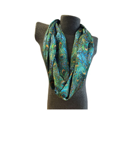 Liberty Silk Satin Scarf, Green Peacock – a lovely richly coloured, opalescent scarf in greens, blues and bronze made from Liberty Belgravia Silk Satin by Lady Crow of Scotland. The attractive design of the scarf is of peacock feathers overlaying blue flowers.