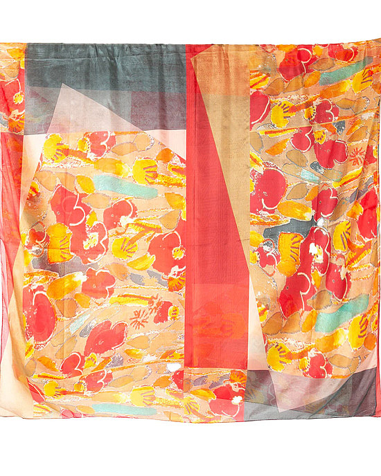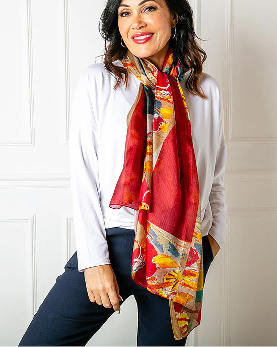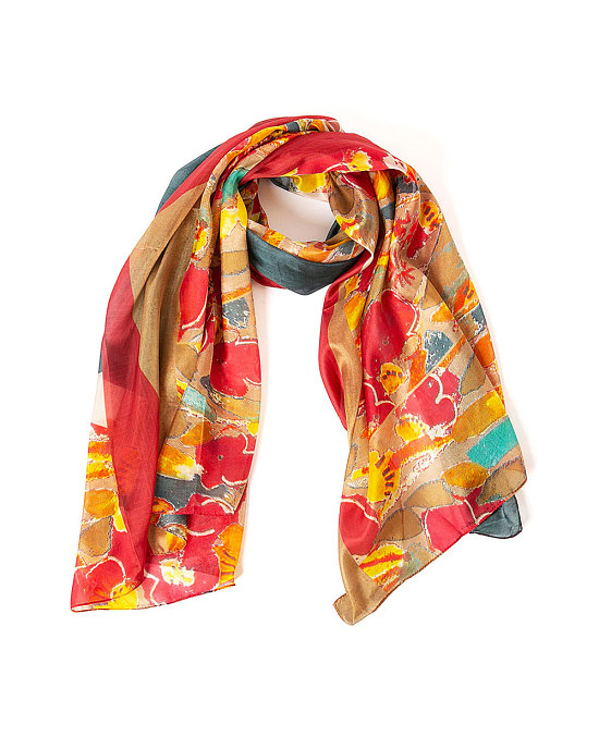 Long Pure Silk Scarf, Fruit Bowl – A pure silk scarf in rich colours, predominantly red and gold.