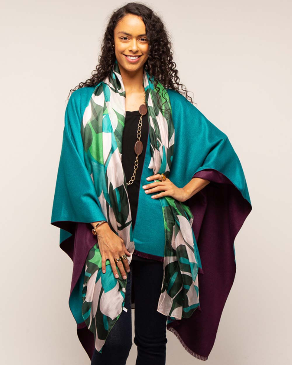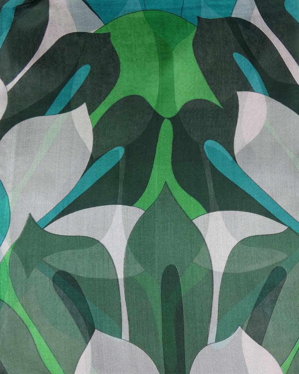 Silk Scarf, Green Floral – a long pure silk scarf overlaid with a floral/leaf design in different tones of green.