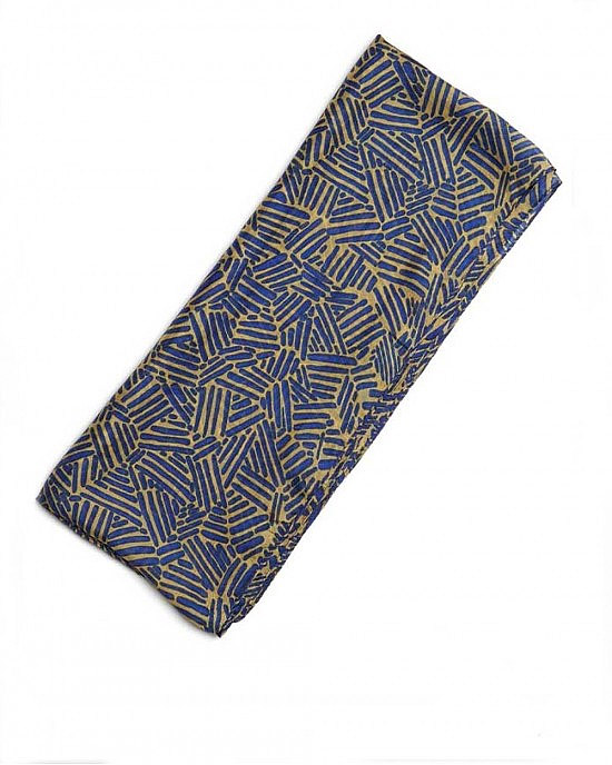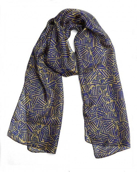 Silk Scarf Trifoli Blue and Mustard – a gorgeously soft, hand printed, pure silk scarf in shades of a green/blue ‘teal’ and grey.